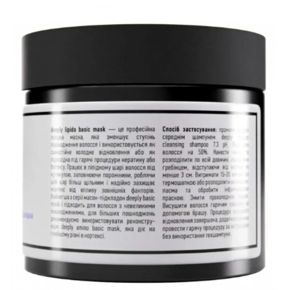 Ліпідна маска deeply lipido basic mask - це професійна маска, яка зменшує ступінь пошкодження волосся і використовується як самостійне холодне відновлення або як підкладка під гарячі процедури кератину або ботексу. Працює в ліпідному шарі волосся під кутикулою, заповнюючи порожнини, роблячи цей шар більш щільним і надійно захищає кортекс від впливу зовнішніх факторів. Найлегший з серії масок-підкладок deeply basic mask і підходить для волосся з невеликими пошкодженнями, для більших пошкоджень рекомендуємо використовувати реконструкцію deeply amino basic mask, яка діє на глибшому рівні в кортексі.