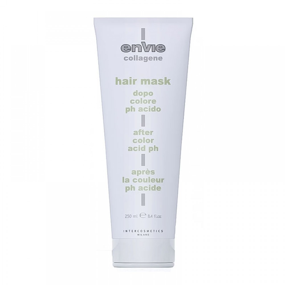 Маска Collagene After Color Mask від Envie (країна-виробник – Італія) розроблена для локонів після процедури фарбування, глибоко відновлює пошкоджену хімічним впливом структуру волосся, налагоджує луски, надає м'якості та блиску сухому волоссю. Кислий рН продукту нейтралізує залишкові лужні процеси та сприяє збереженню кольору. Колаген у складі маски підвищує пружність та міцність локонів, робить їх зволоженими та шовковистими.
