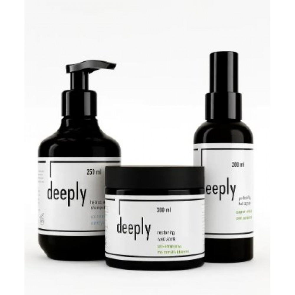 Потужний триетапний догляд для сухого, пошкодженого та ослабленого волосся. Цей набір поєднує найкращі продукти бренду deeply — шампунь, маску, що відновлює, і універсальний захисний спрей. Ваша довжина відтепер у надійних руках!