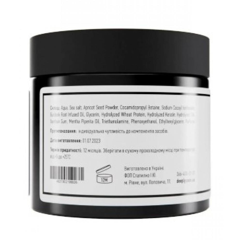 deeply scalp scrub with apricot kernel - це скраб для шкіри голови, призначений для дбайливого очищення шкіри голови від залишків стайлінгу, силіконів, які містяться в домашньому догляді за волоссям, а також відмерлих часток шкіри та надлишків жиру. Формула, яка містить дрібні частини абрикосової кісточки та морську сіль, ефективно позбавляє шкіру голови від забруднень, сприяє підвищенню кровообігу та прискоренню росту волосся, нормалізує виділення себуму, що підходить для боротьби з надмірною жирністю.