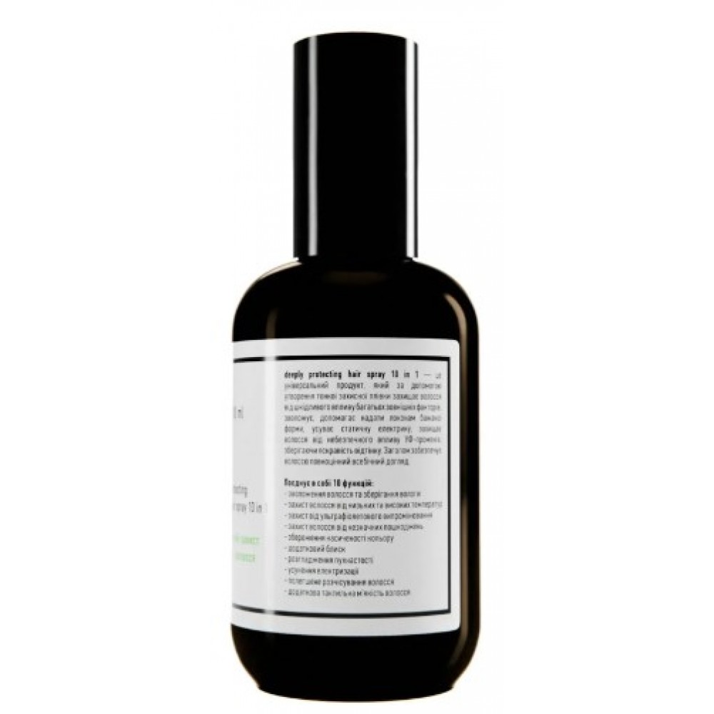 Спрей-захист для волосся 10 в 1 deeply protecting hair spray 10 in 1 - це універсальний продукт, який за допомогою утворення тонкої захисної плівки захищає волосся від шкідливого впливу багатьох зовнішніх факторів, зволожує, допомагає надати локонам бажаної форми, усуває статичну електрику, захищає волосся від небезпечного впливу УФ-променів, зберігаючи яскравість відтінку. Загалом забезпечує волоссю повноцінний всебічний догляд.