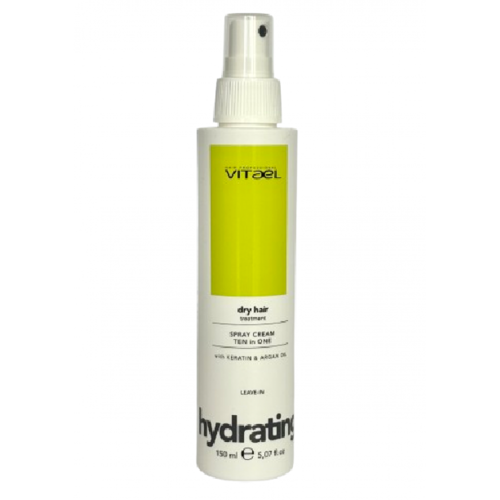 Термозахист Vitael Dry Hair Spray Cream Ten In One – це ефективний спрей-крем для швидкого зволоження та захисту від термічної дії сухого волосся. Продукт забезпечує локонам блиск, зволоження, шовковистість, а також дисциплінує пасма по всій довжині. Спрей-крем інтенсивно захищає локони від нагрівання феном, інструментами для укладання, а також негативного впливу зовнішніх факторів. Легка текстура спрею швидко вбирається, насичує волосся корисними мікроелементами та надає волоссю здорового вигляду. Після нанесення спрею-крему волосся виглядає еластичним, пружним і блискучим. Продукт підходить для всіх типів волосся.